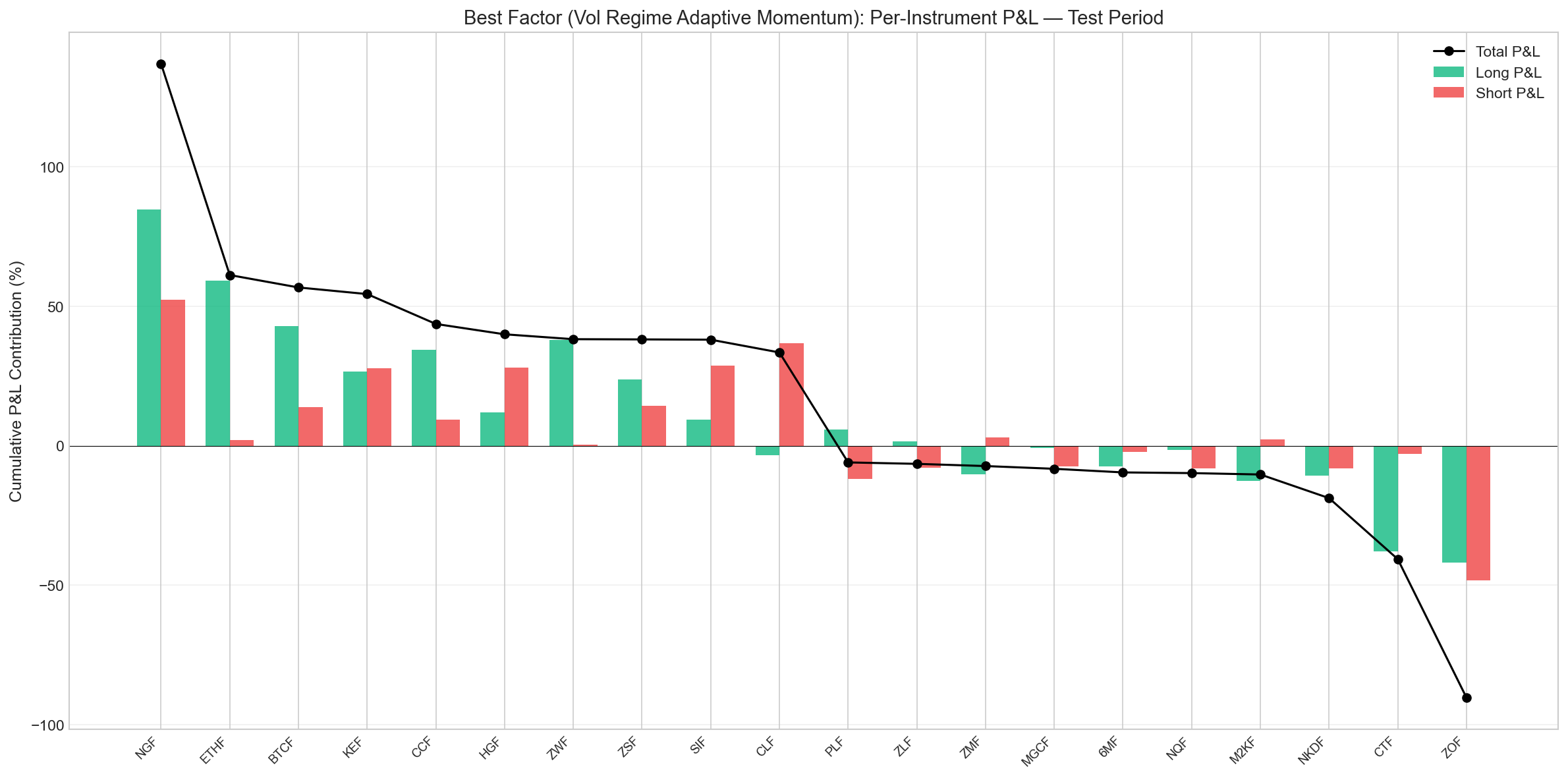 Most profitable instrument: Natural Gas (NGF) dominated the P&L, contributing +136.9% in cumulative returns during the test period — roughly a third of the strategy's total gains. This came from both the long side (+84.7% from 96 long days) and the short side (+52.2% from 92 short days). Natural gas's extreme volatility and regime-switching behavior made it an ideal fit for a factor that explicitly adapts its lookback window based on volatility regimes.